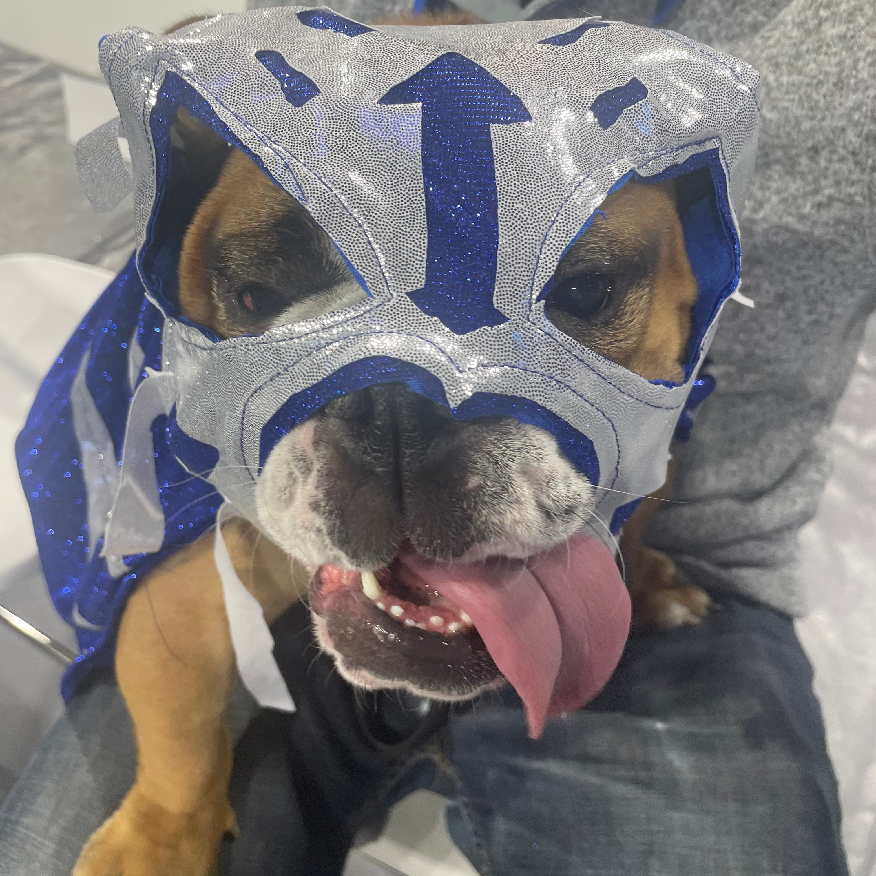 Paisley was a crowd favorite during the 2024 Drake University Beautiful Bulldog Contest. Honestly, she should have won, but I’m clearly biased. My partner and I had a custom luchador outfit made for her. Looking back, we probably should have dressed her as Gene Simmons from Kiss to really resonate with the crowd. Maybe she would’ve won!